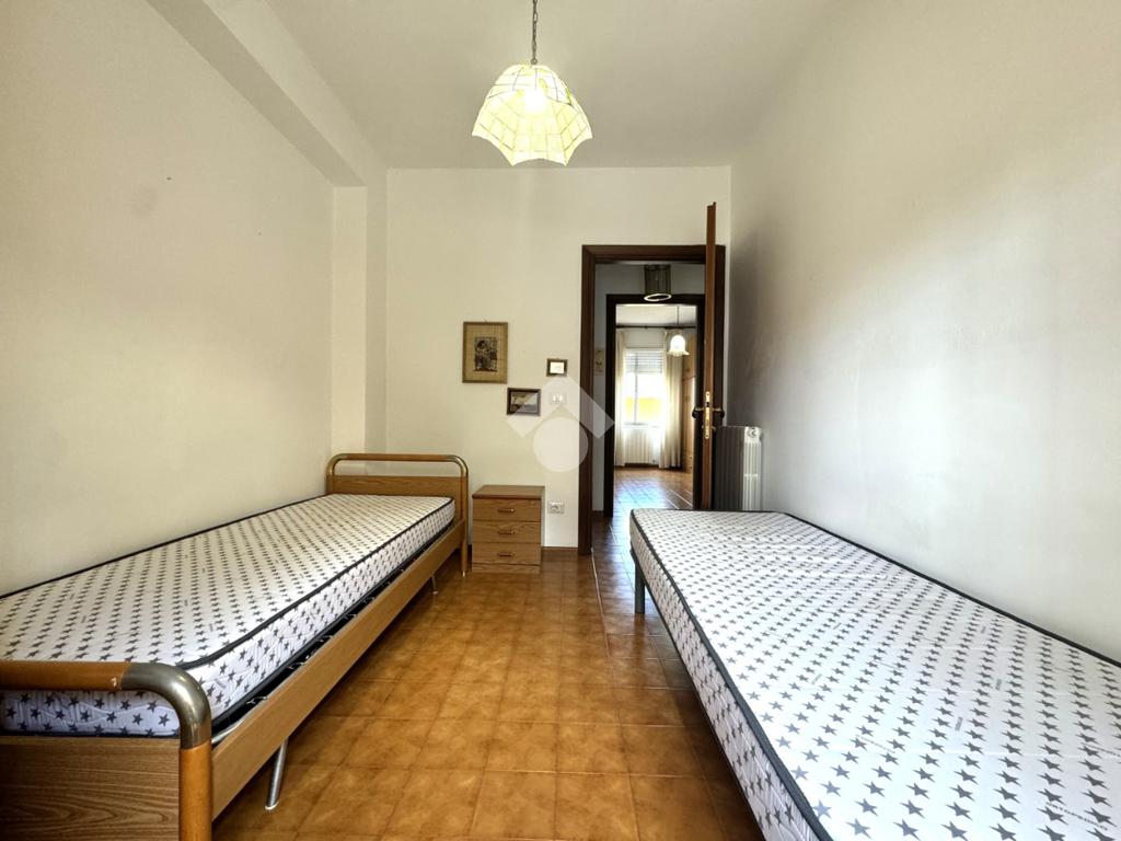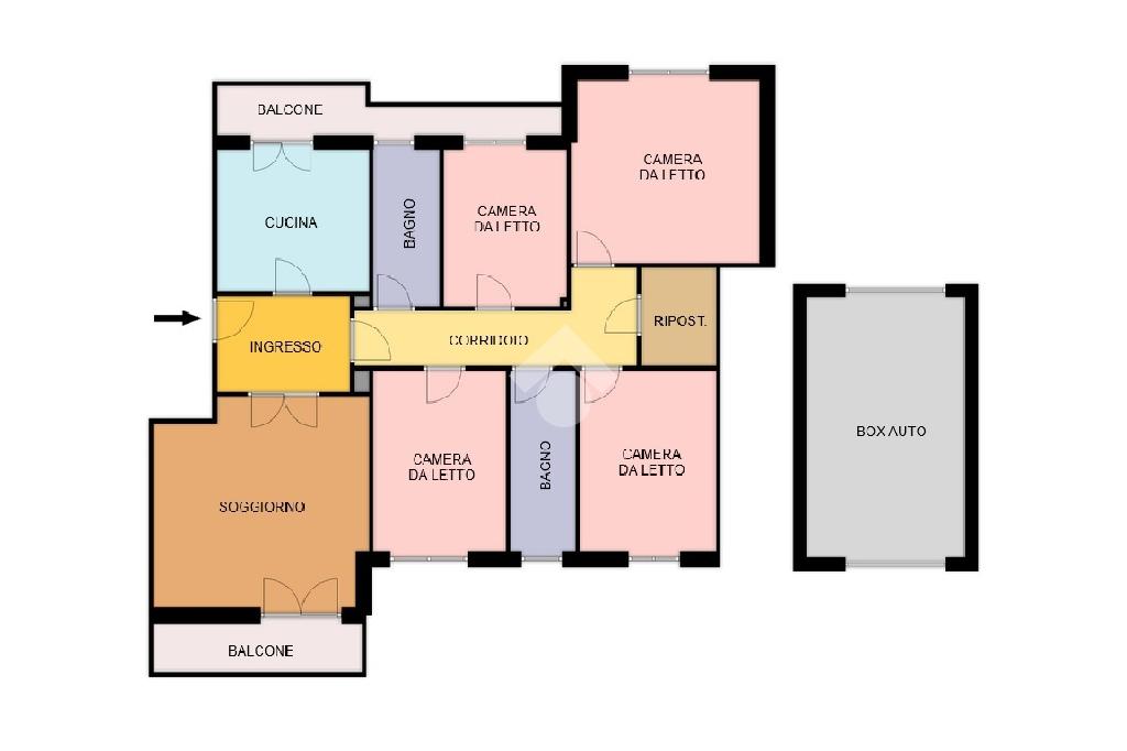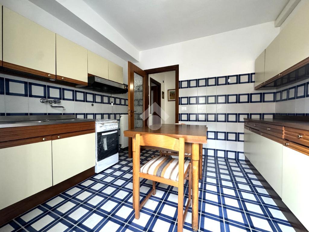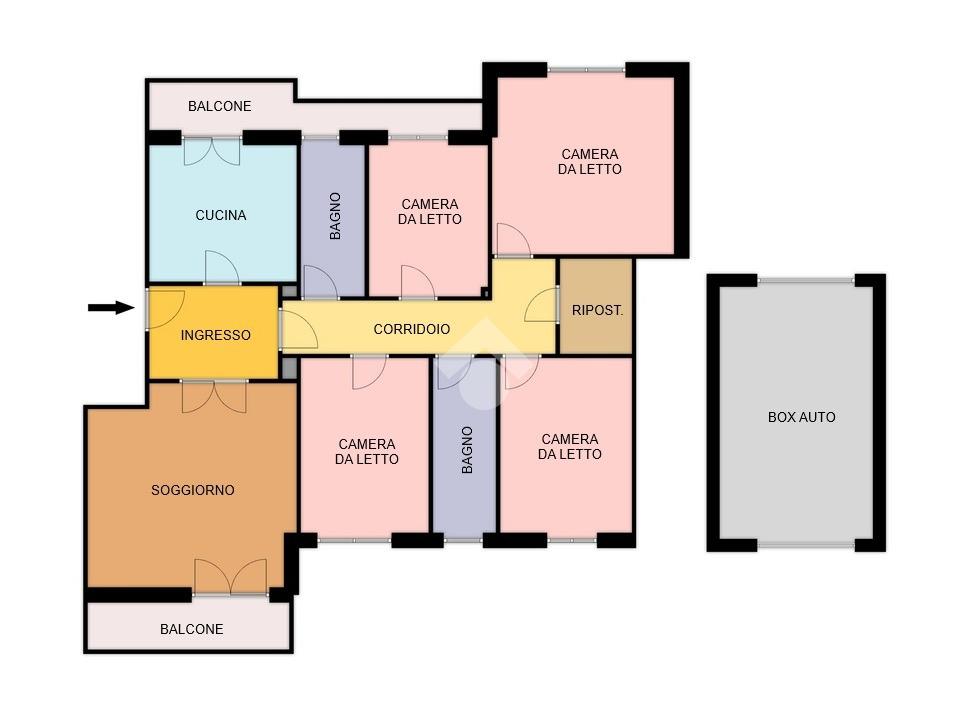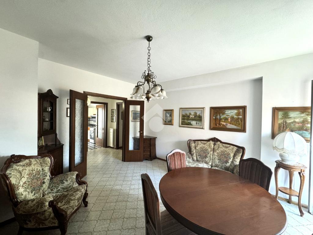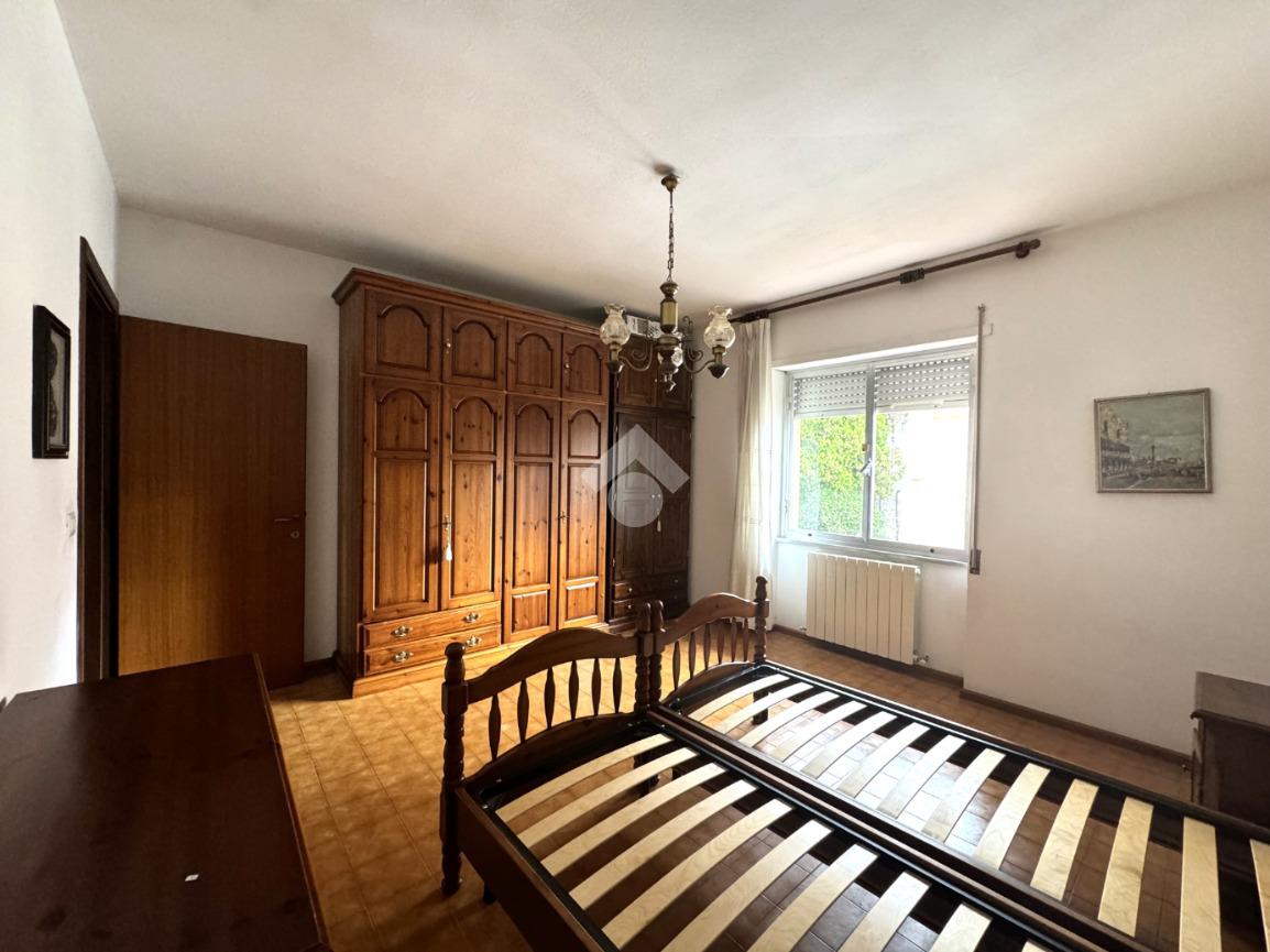 Tramite delle scale comuni o con comodo ascensore, si raggiunge il piano primo, dove si viene accolti da un ampio ingresso che collega tutti gli ambienti della casa. La zona giorno è costituita dal luminoso soggiorno sulla destra e dalla cucina abitabile sulla sinistra dell'ingresso. La zona notte si sviluppa su entrambi i lati del corridoio ed è costituita da quattro camere da letto, due bagni finestrati e un comodo ripostiglio. Al piano seminterrato è presente un ampio box auto con comodo accesso. L'immobile si presenta in buono stato manutentivo, è provvisto di riscaldamento autonomo a radiatori e viene venduto con arredi.