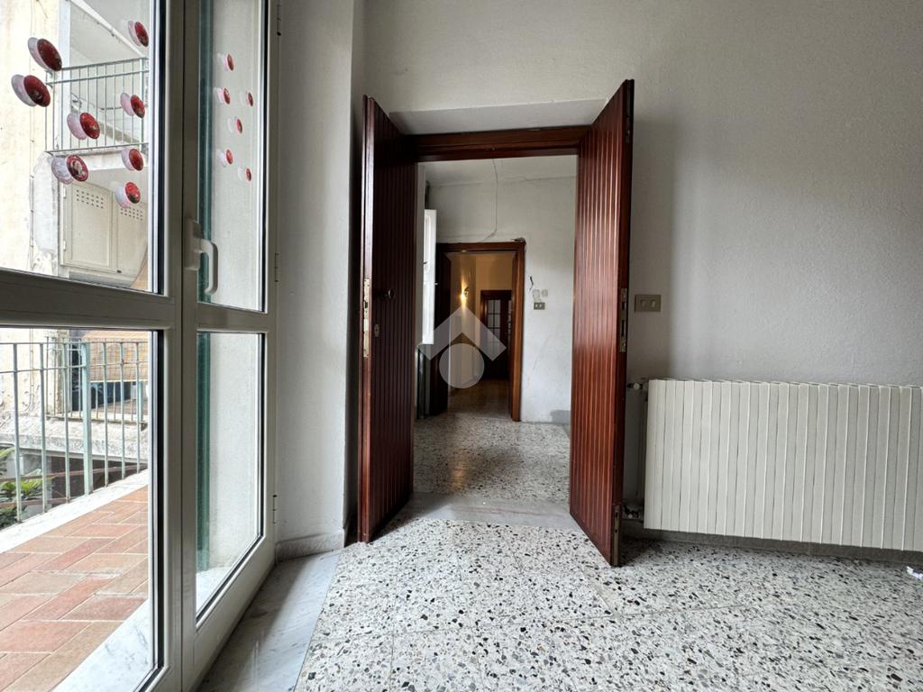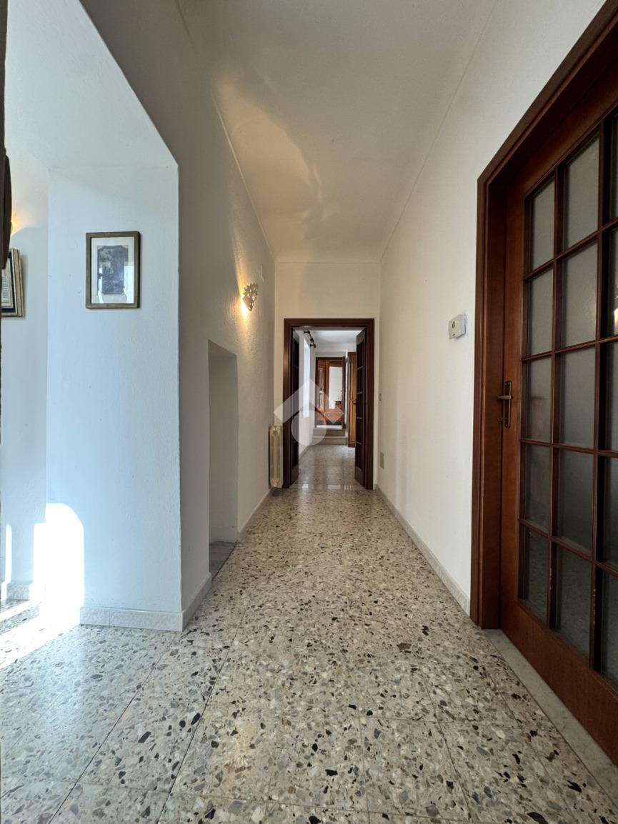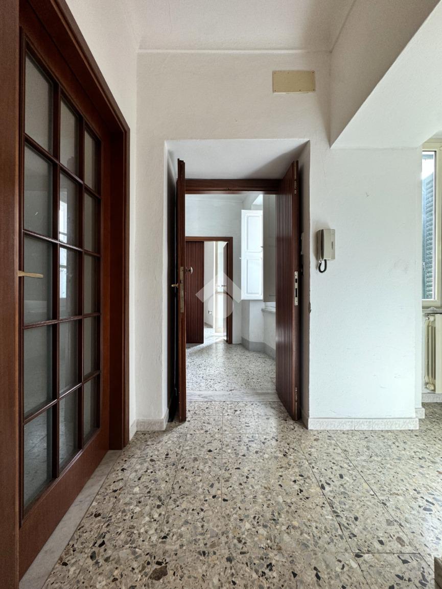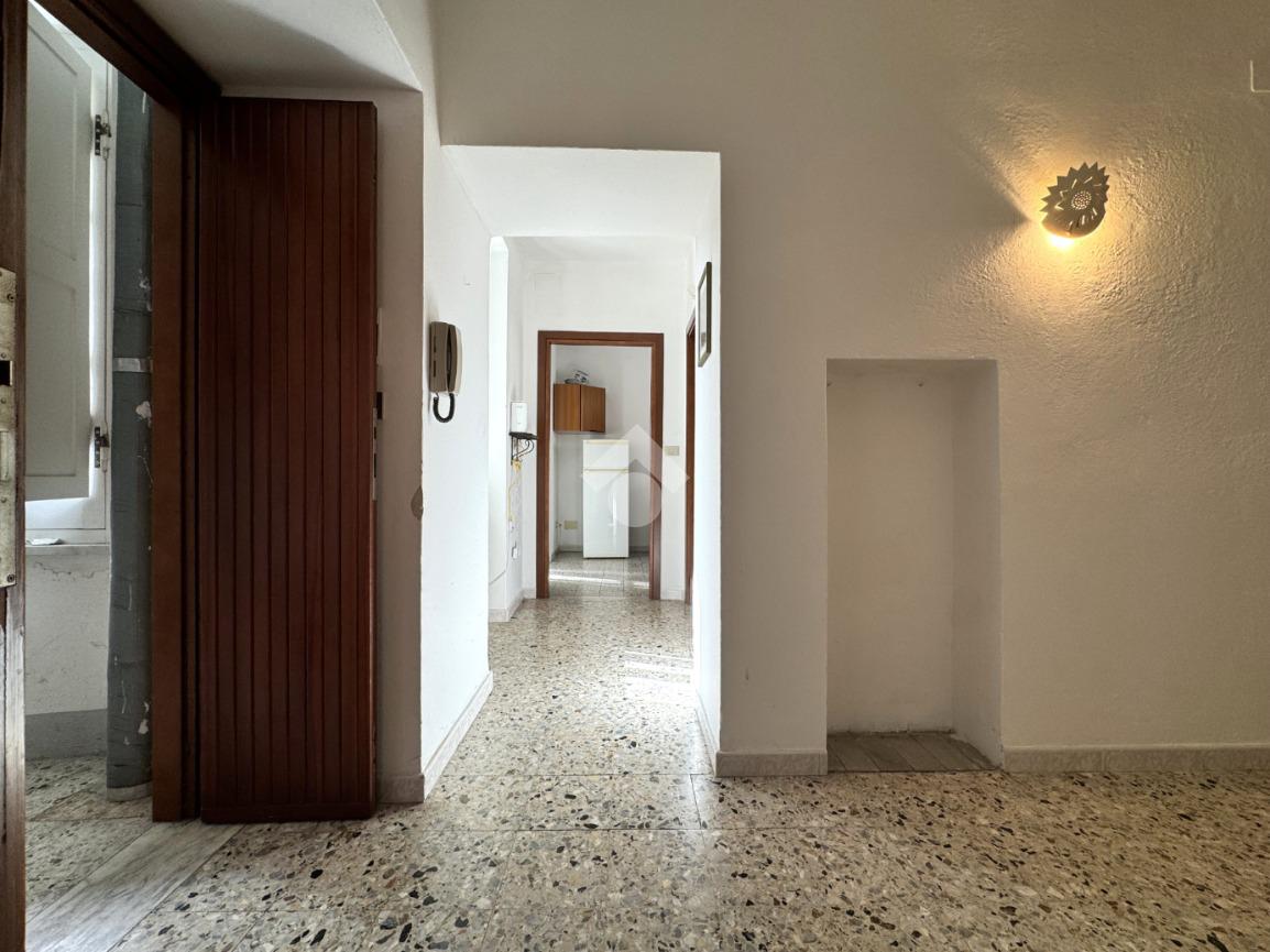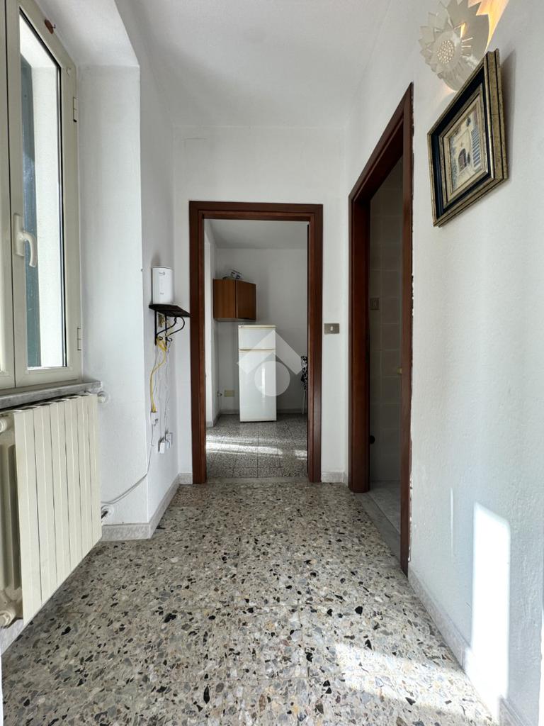 Attraverso una scala comune ad altri due appartamenti, si arriva all'ingresso dell'ampio soggiorno con doppia finestratura, separato internamente rispetto al resto dell'immobile, ma collegato a un disimpegno e alla cucina tramite il balcone esterno.