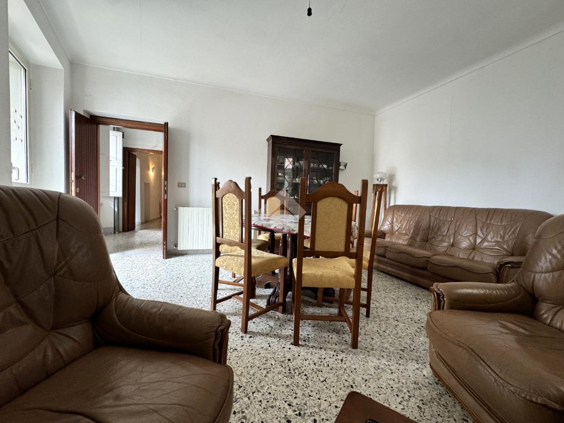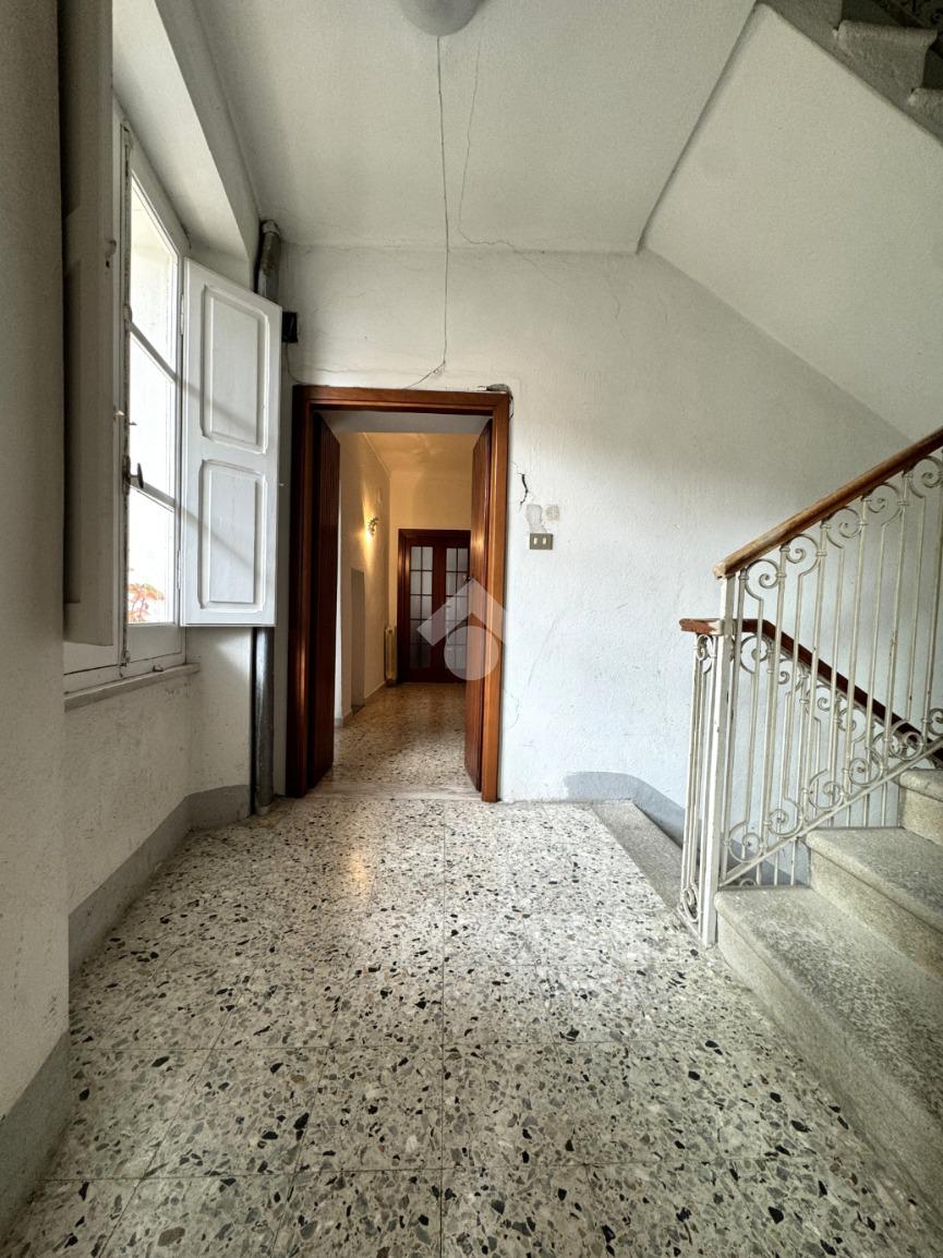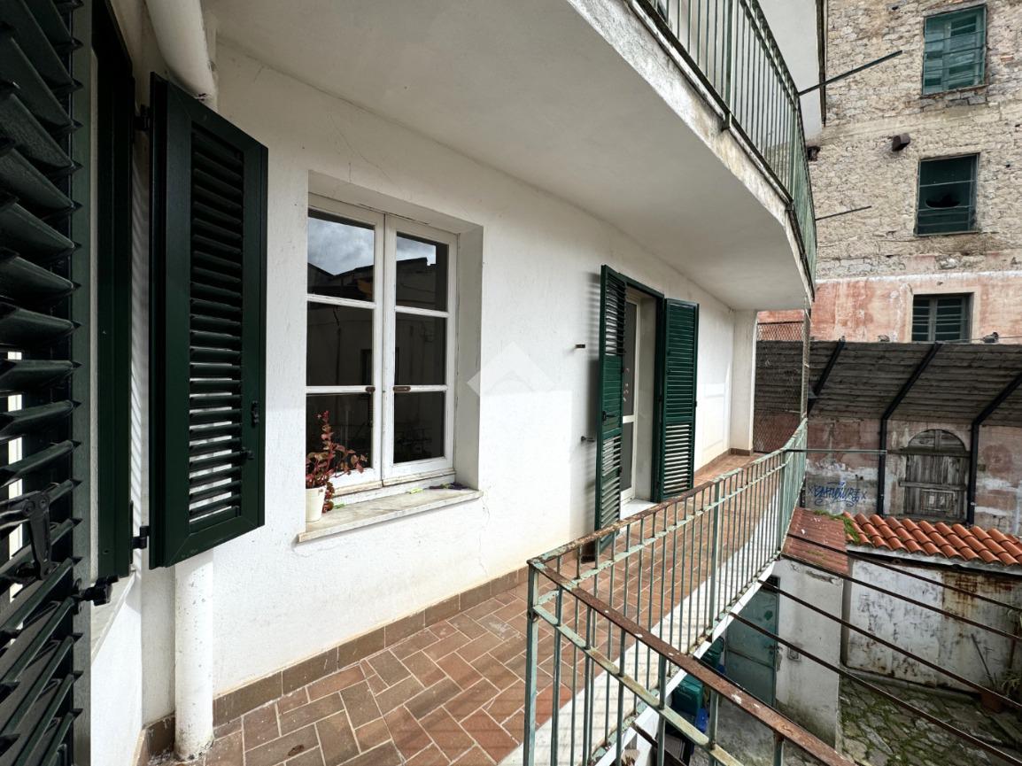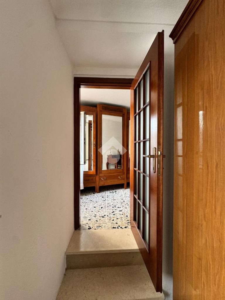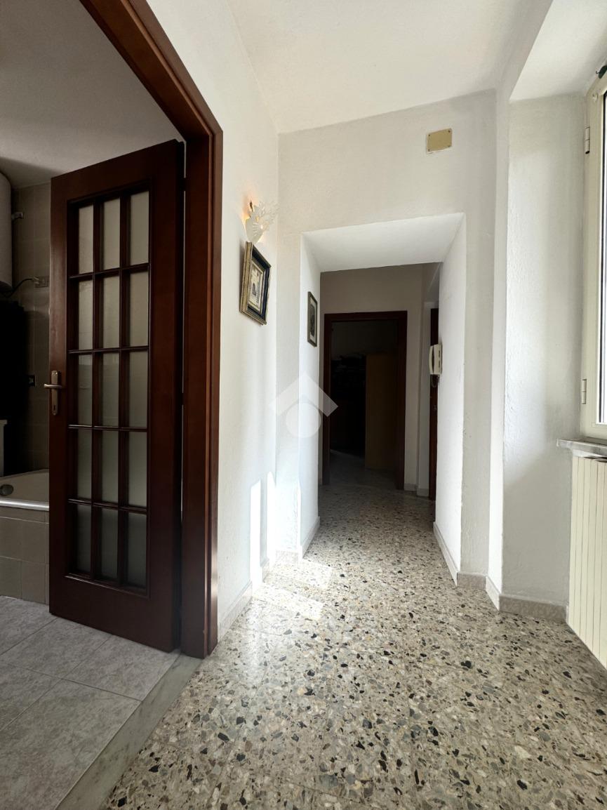 Attraverso una scala comune ad altri due appartamenti, si arriva all'ingresso dell'ampio soggiorno con doppia finestratura, separato internamente rispetto al resto dell'immobile, ma collegato a un disimpegno e alla cucina tramite il balcone esterno.
