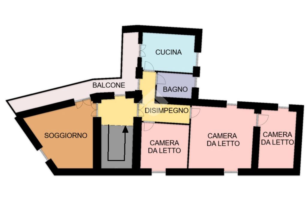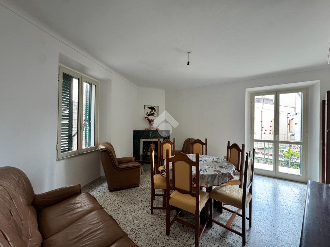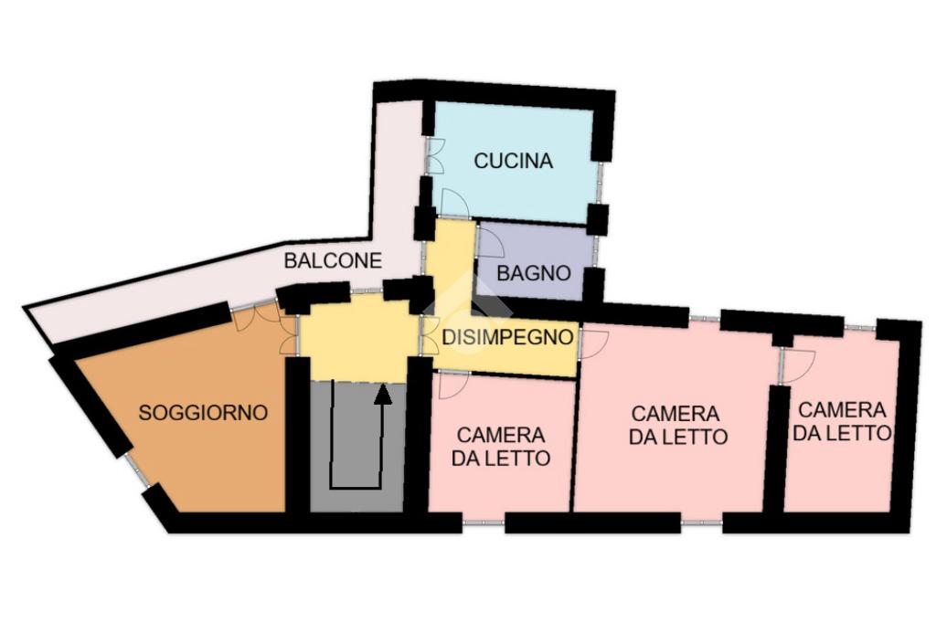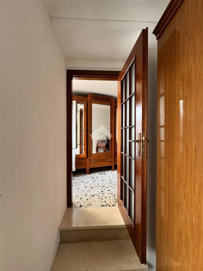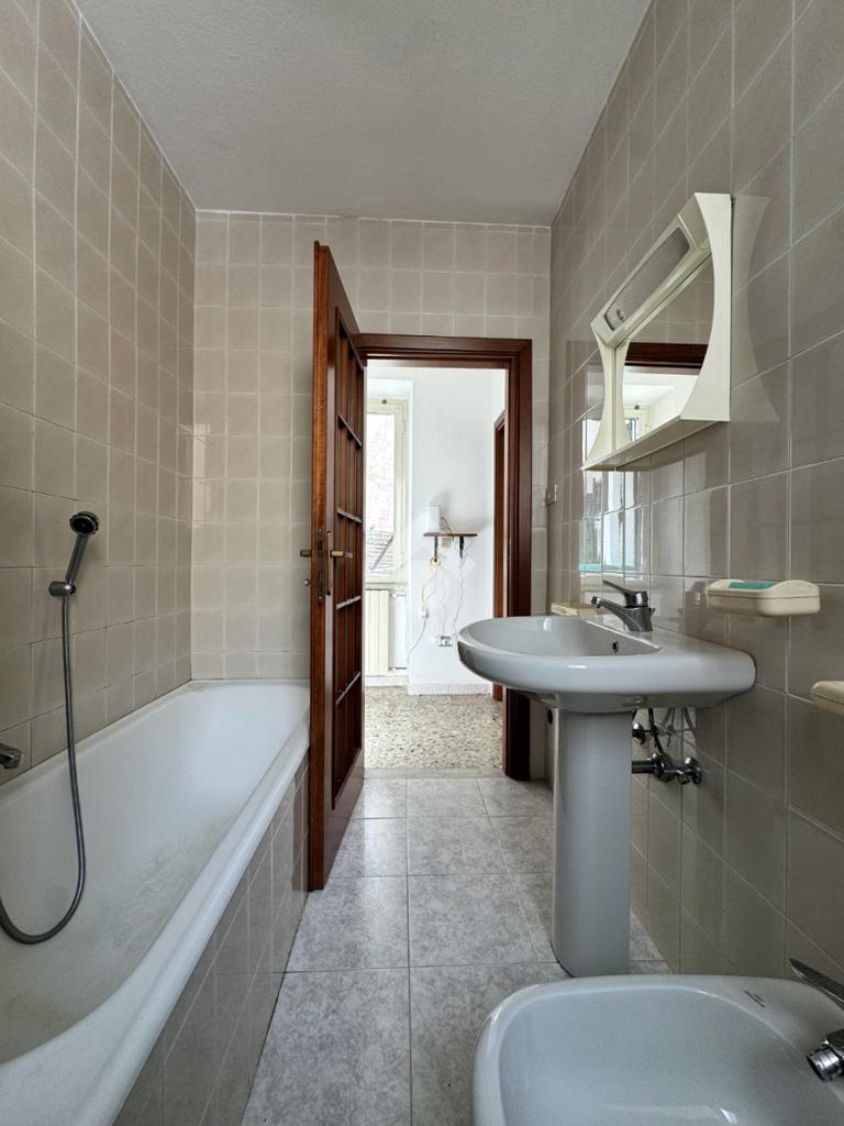 Attraverso una scala comune ad altri due appartamenti, si arriva all'ingresso dell'ampio soggiorno con doppia finestratura, separato internamente rispetto al resto dell'immobile, ma collegato a un disimpegno e alla cucina tramite il balcone esterno.